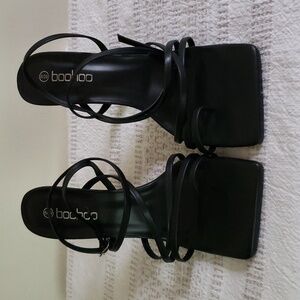 Boohoo black strappy stiletto heels, toe loop, sexy heels, date night.
