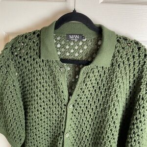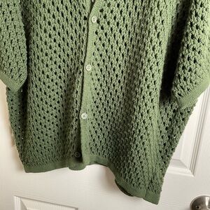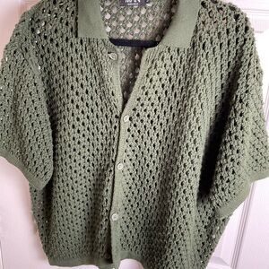 Oversized Boxy Textured Open Stitch Knit Shirt In Stylish olive green knit cardigan. Features short sleeves and button-up front. Perfect for layering.