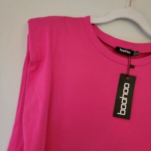 Hot pink jersey tee with structured shoulders, boxy oversized fit.