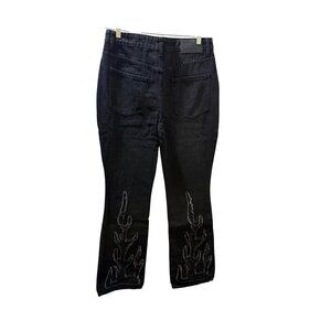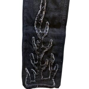 These black jeans feature a unique flame-like embroidery on the lower legs, blending edgy style with casual comfort. Straight fit for everyday wear.
