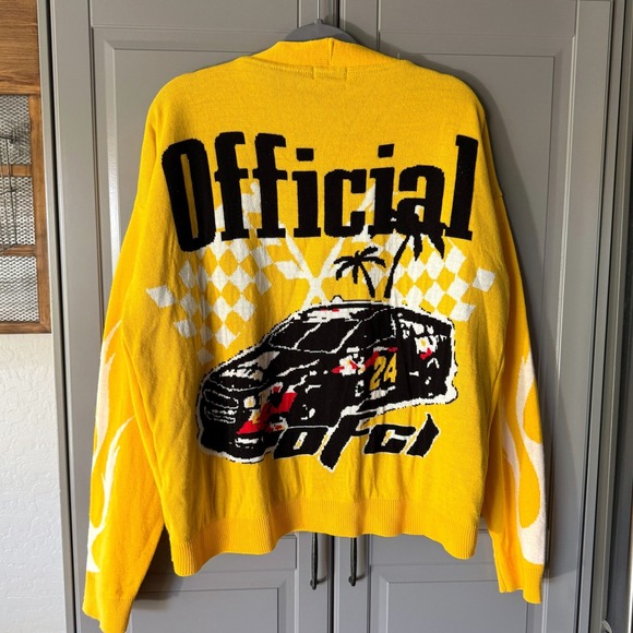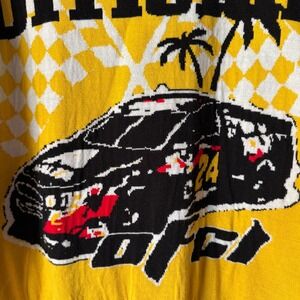 Keywords: graphic knit, racing theme, streetwear, designer inspired, bold print, statement piece, casual wear, fall fashion, winter style, unique design, embroidered, embroidered graphic, knitwear