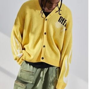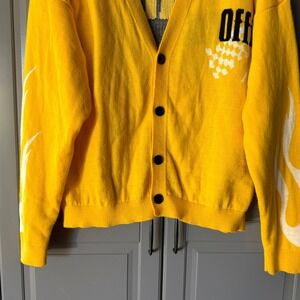 -BoohooMAN yellow graphic knit cardigan sweater. -Features contrasting black buttons, a V-neckline, and bold flame graphics on the sleeves.