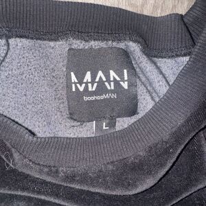 This is a women's black sweater in size Large from boohooMAN. It features a crew neck, long sleeves, and a solid pattern with fuzzy soft material made from polyester and cotton. The sweater is adorned with a rose theme, giving it a stylish and feminine touch. This pullover sweater offers free shipping and is perfect for adding a cozy yet trendy vibe to your wardrobe.