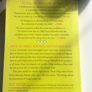 Hi! This book is called “Me Earl and the Dying Girl” there is a movie based off this book and it is in her good condition!