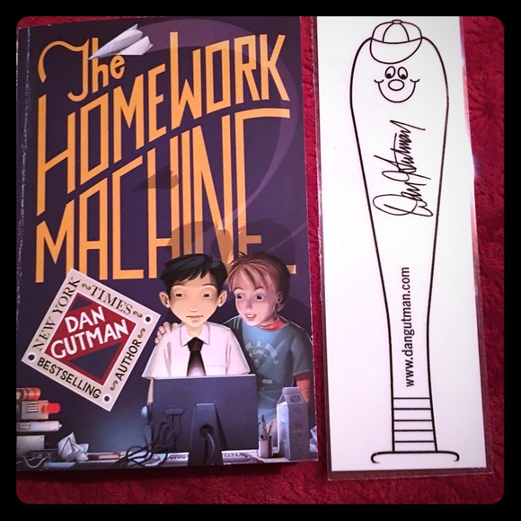 This is a book called The Homework Machine and is a signed copy by Dan Gutman, the author. This also comes with a Dan Gutman bookmark.