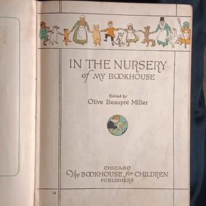 This is the 1925 printing of the: My Bookhouse In The Nursery # 1 of a series. It's in very good condition. A tear on page 23/24. Markings on page 27 and page 29. Some yellowing from the years. The rest of the pages are clean.