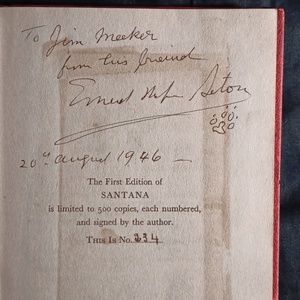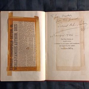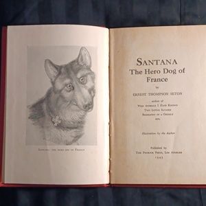 This is a limited number 234 of 500, only signed first edition. Santana The Hero Dog Of France: Ernest Thomson Seton. The founder of The Boy Scouts of America. Very good condition. Chip on top left corner of binding. Stain from obituary on the signature page. Wonderful rare collectors addition.
