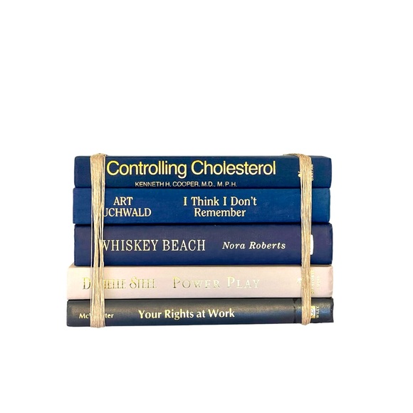5 books three are navy blue one is light gray the other is dark gray. All have gold lettering wrapped hemp cord.