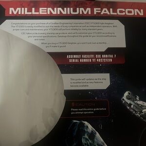 Take the fastest ship in the galaxy for a spin! The 3-D Owner's Guide provides a pilot's view of the Millennium Falcon, from her armaments and defense to her life support and propulsion Each page details the technology of a different system with a meticulously illustrated cutout. When the guide is closed, the cutouts fit together to crate a three-dimensional model of the famed YT-1300 light freighter.