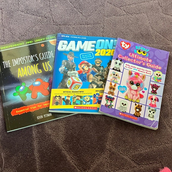 Three Scholastic activity and guide books shown. Bright covers with game and collectible themes. Includes colorful character art and tips. Ideal for young readers and fans.