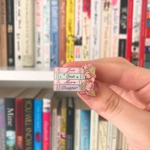 Enamel lapel pin brooch of a stack of books in pastel colors with floral design and cursive script on the book spines with “Just One More Chapter”. Pastel flower blossoms. Pastel enamel set in gold tone metal, pin has a clasp backing. Approximately 1.25” high. Item is New. Great for the bibliophiles, book lovers, readers, literary fans!! Place onto a lapel, hat, purse, scarf, shawl, jacket, backpack, sweater, or anything really.