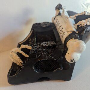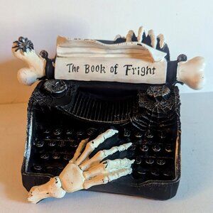 Creepy black resin 'Book of Fright' haunted typewriter with skeleton and bone details by Michael's Ashland Halloween collection. This spooky gothic decor item features two disembodied skeleton hands, one typing and one sneaking up at the top of the old manual typewriter, a spider and spiderwebs, a bone roller or cylinder for paper, and a page that reads 'Book of Fright', all in the spirit of Wednesday Addams :>