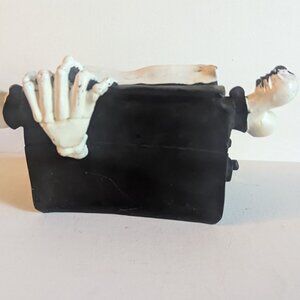 It is in as-is condition, with a large hole in the bottom side of the item, and some scrapes in the white paint. This doesn't really detract from the appearance of this eerie tabletop decor item, which measures approx 10" width x 6" tall x 8" deep, and is new with tags. An eerie goth decoration for a Halloween haunted house, Day of the Dead, Valloween or any other time you're feeling spooky!