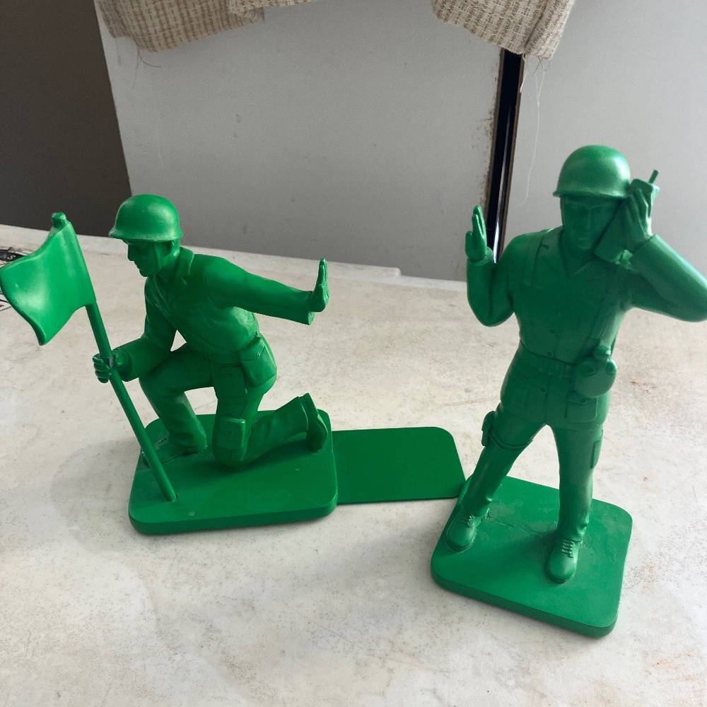 Toy Story inspired Green Army men bookends Radio operator stands at 7 1/4” Flag soldier is at 6”