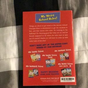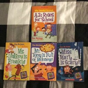 Books My weird school daze book 10,11,12 and a bonus book.10- Miss Mary is Scary. 11- Mr.Tony is full of Baloney. 12- Ms. Leakey is Freaky. Bonus- A.J.’s rules for school. Books written by Dan Gutman