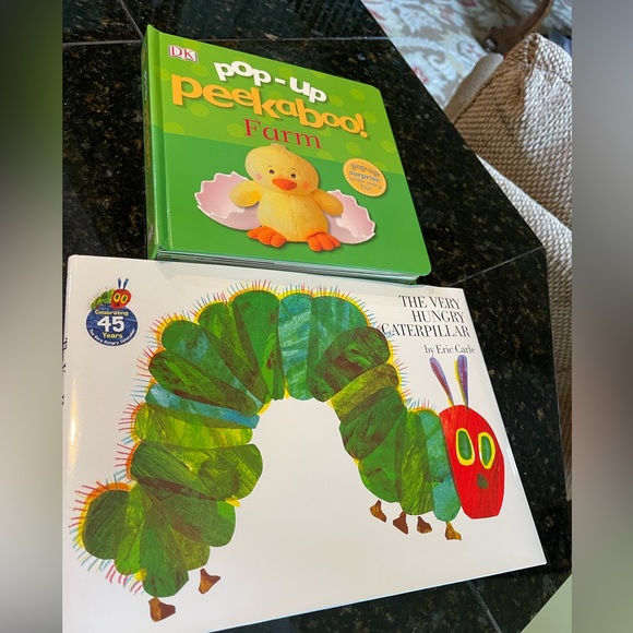 2 children’s books a pop-up peekaboo farm book hat has a surprise on every page with a pop-up flap and the famous “the very hungry caterpillar book”! Both like new!