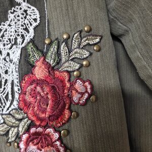 Boom Boom Jeans Jacket L Skull Green Floral Embroidered Button Military Style