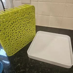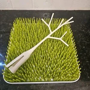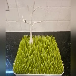 Green grass drying rack with a white tree accessory. Perfect for drying bottles and accessories. In excellent condition