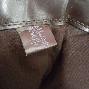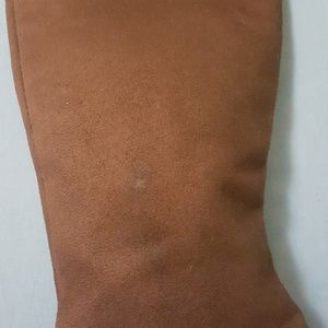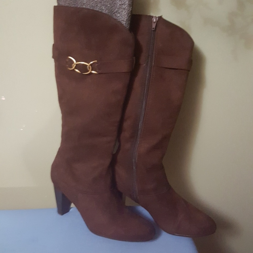 Dark Brown suede material boot, inner zipper with gold hardware, size 71/2, 3inch heel, wore 2-3 Times. Slight scuff on (L boot heel), nothing some shoe polish won't fix & 2 tiny stains to same side, see pic #6 & 8 Very stylish & comfortable.