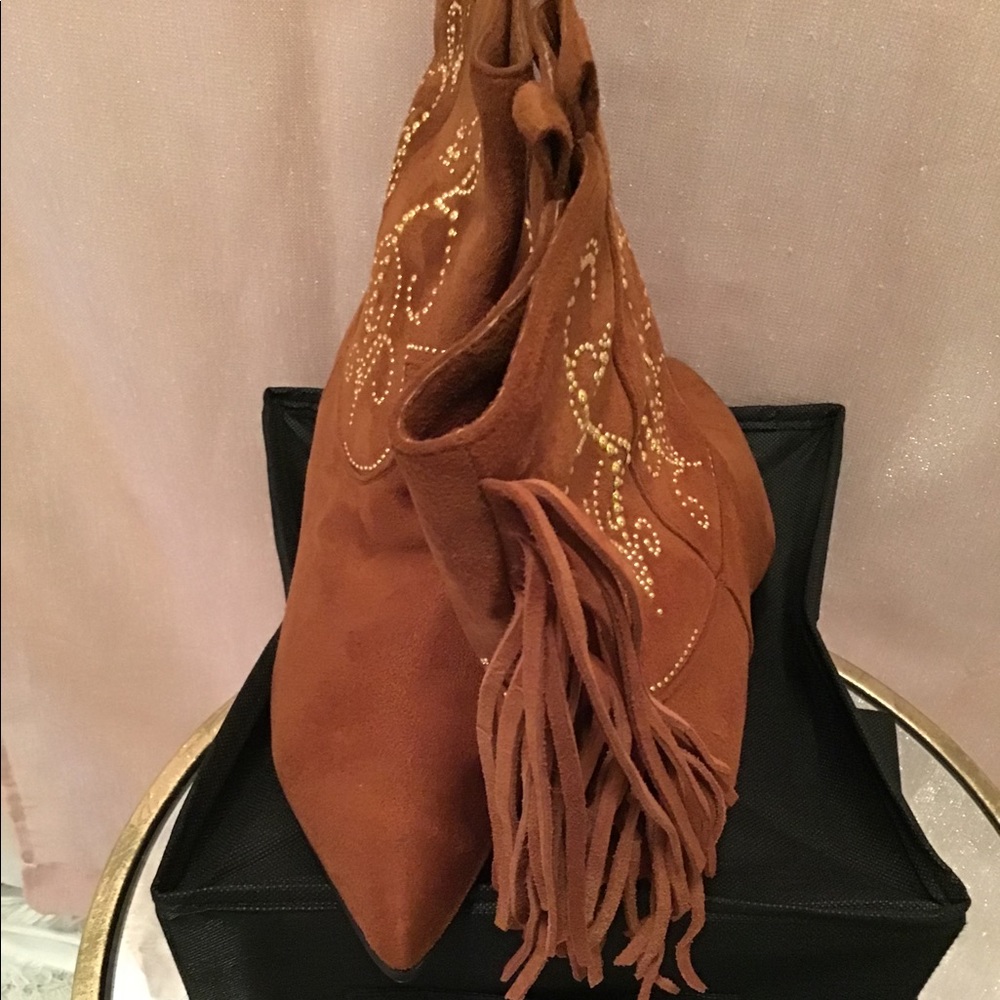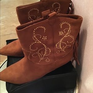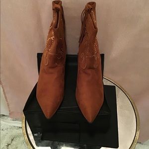 Tan gold embroidery fridge 12m 2inch heel pull on a little above the ankle boot
