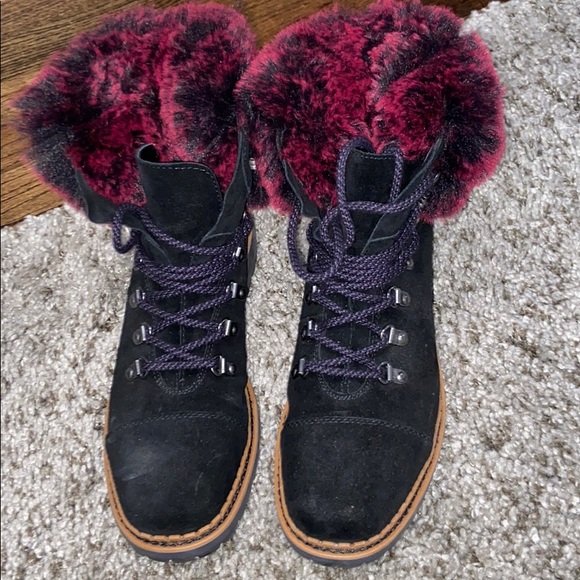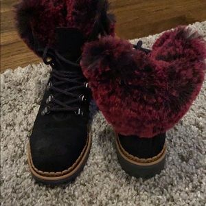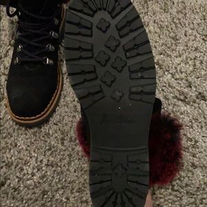 Lace up faux fur cuff with suede upper and rubber sole..super cozy winter bootie. Only worn few times minor scuff on suede. Heel measures about 1 1/2”. Ran big for me I’m usually 8 1/2 and I got these in a size 8