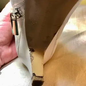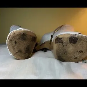 Beige ankle boot with open toe. Used condition Most wear is from bar stools on inside heel LOL I just scrubbed them and it removed some of the inside leather. See pictures.