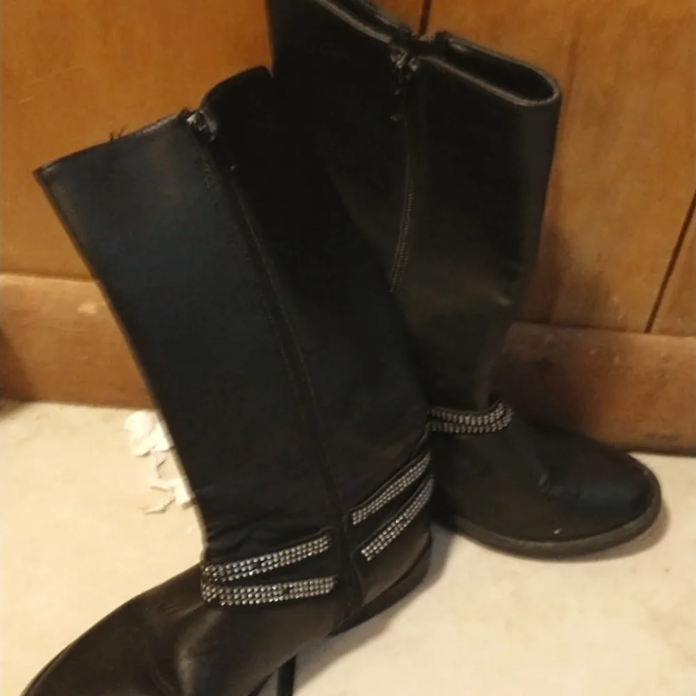 black zipper boots with diamond straps around the boot
