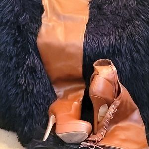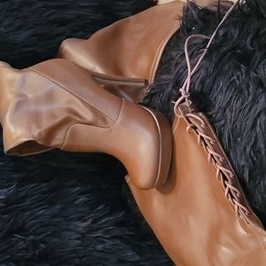 Thigh high brown boots with lace up in back