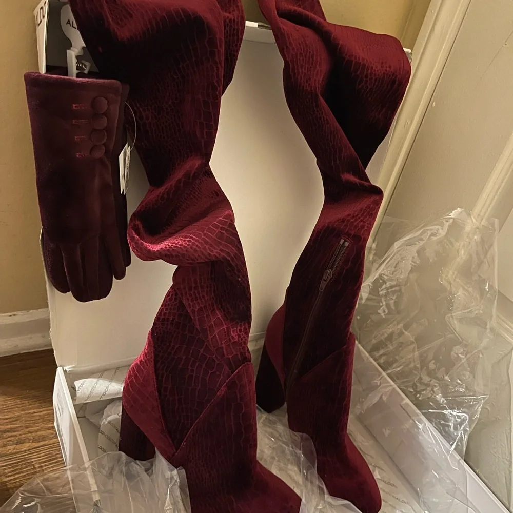 TENESHA Purple “ Burgundy” Woman boots From ALDO size 9 New with a tag include TEHNO CHIC Burgundy gloves both for $100