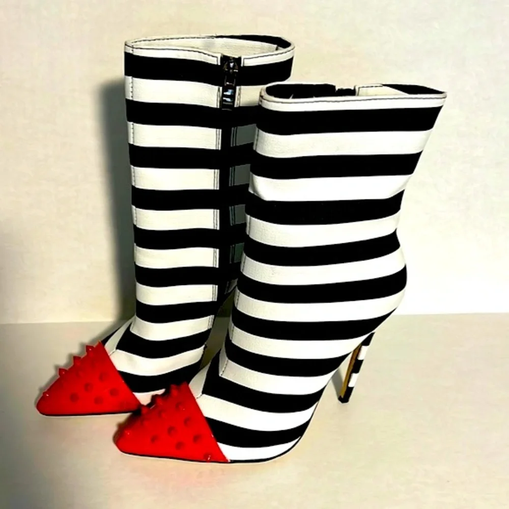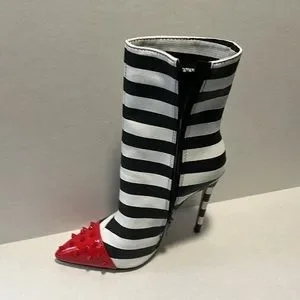 This boot is man made leather, black and white striped, with a red prickly point that add a pop of color and style. The heel is about 4 1/2 inches.