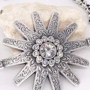 This silver and Swarovski crystal spur boot bracelet is made with a beautiful connector that I took from a vintage Nocona chain belt. I have added vintage rolo chain from a Brighton chain belt to finish the piece. It is adjustable up to 14 1/2' and has a lobster clasp.