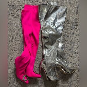 Vibrant pink high heel boots with silver embellishments. Shiny silver finish adds a bold touch.