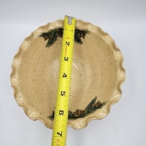 This bowl was hand made by artisans in Kansas in 2002. Lovely speckled glaze, this ceramic piece also boasts pine & pinecone paintings.