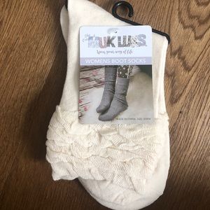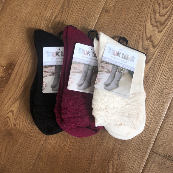 Women’s boot socks with ruffles from Muk Luks, size: OSFM. Pack of three: black, maroon, and white. Never worn with tags. Super cute winter socks!