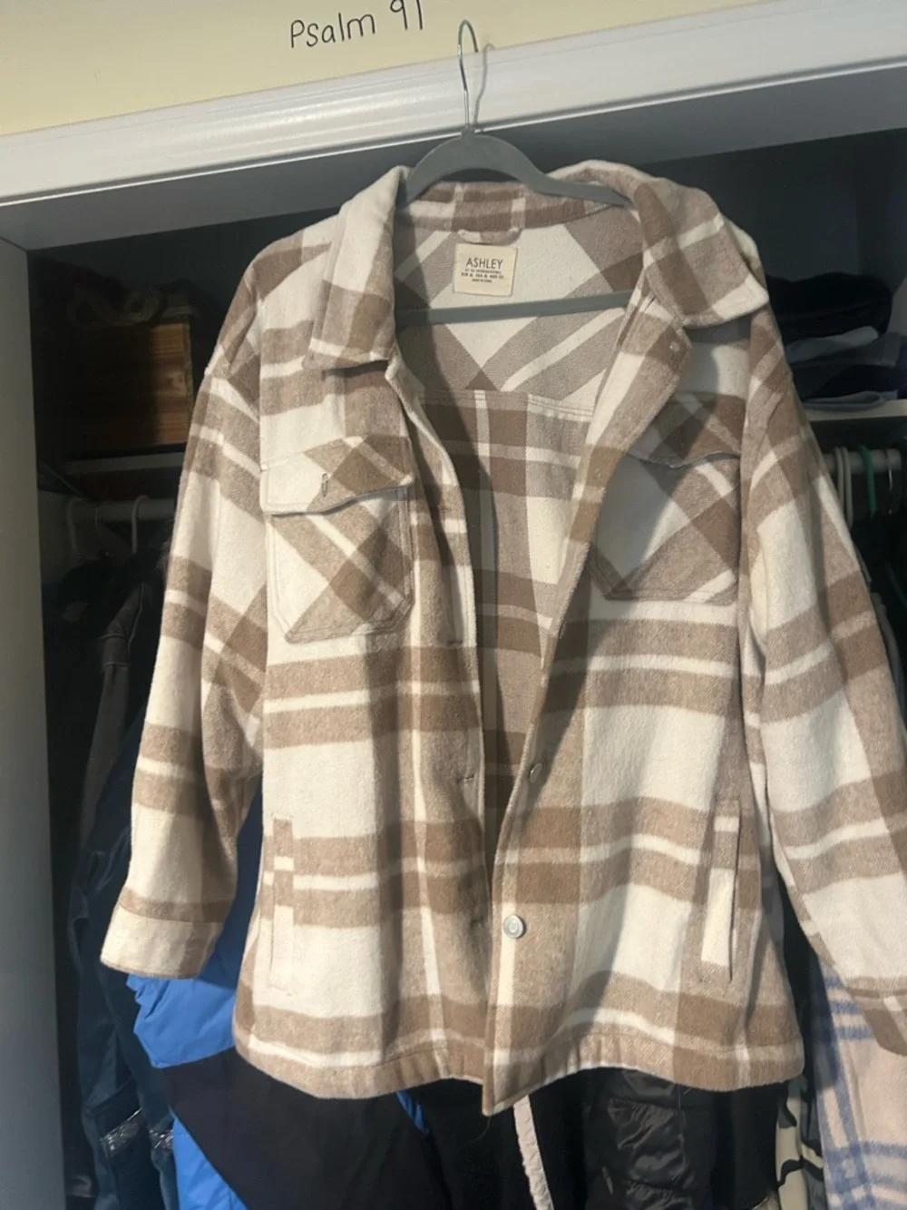 Cozy plaid shacket by Ashley, bought at boot barn. Soft textured fabric with a relaxed fit. Button-front closure and flap chest pockets. Easy layering piece for casual outfits. Like new.