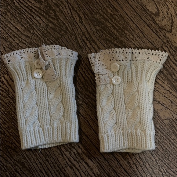 Ivory colored boot cuffs with lace and two buttons at the top.