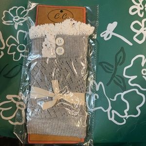 C.C grey knit boot cuffs with white lace ruffles and buttons