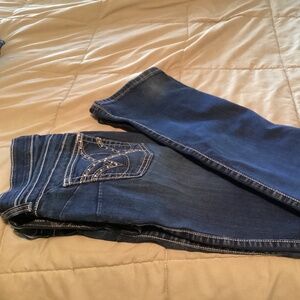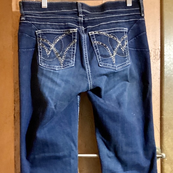 Medium rise, QBaby no gap waist band. Boot cut, medium wash. Size 7/8 x36 length. Looks new. Worn only a handful of times as I prefer high waisted.