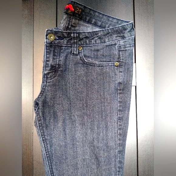 These are a dark denim blue almost black washed out slim boot cut jeans. pair with wedge's or flats.