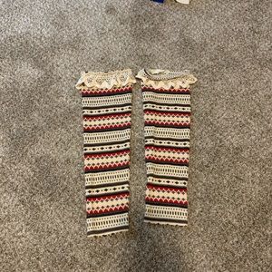 Winter festive print footless boot socks. Lace comes over top of boots. Stretchy sweater material makes up legs.