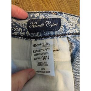 These are regular wash denim BootHeel Trading Co. Kennett Capri jeans with embroidered back pockets. These jeans measure 29.5 inches in length, 18.5 inches at the inseam, 18 inches at the waist, and 21.75 inches at the hips. These jeans are preloved with no flaws.