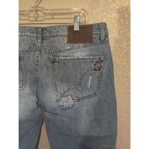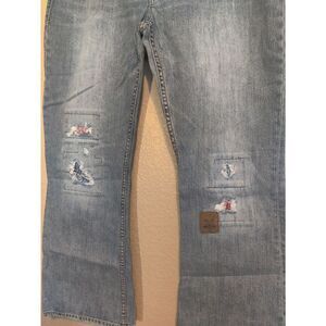 These are distressed and patched, light wash denim BootHeel Trading Co. Kennett boot cut jeans. These jeans measure 38.75 inches in length, 28 inches at the inseam, 18 inches at the waist, and 22 inches at the hips. These jeans are preloved with no flaws.