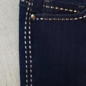 Jeans have metallic sheen, silver embroidery, accents along waistband and running down each leg, hip area. Brand name and pocket edging is also accented. Button is jeweled, as well as jeweled pocket rivets.