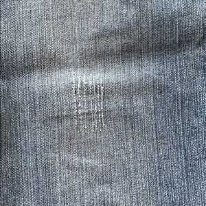 Stylish and unique jeans bleached diagonally at the bottom of Boothe legs.