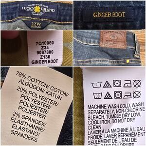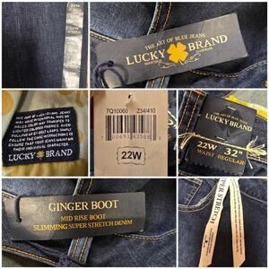 Dark wash super stretch denim w/ factory fading, sanding, whiskering. 5 pocket, button/zipper fly, mid rise, boot cut silhouette. Minor shelfwear issues noted in photos. New, with tags. Size 22W by Lucky Brand. Style: Ginger Boot