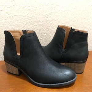 Designed with oil finish distress leatherette upper, round toe, stitch accents, slit at side panel, stacked block heel, and side zip for easy slip on and off.