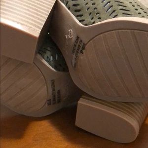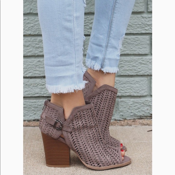 Featuring an ankle peep toe bootie crafted from suede leatherette upper with an all over perforated laser cut design, buckle detail and rear zipper closure set atop a chunky block heel. Heel: 4". Fits true to size. Brand new never worn with shoebox. Cover photo for modeling purpose only. Actual shoe color is Khaki. Photos provided.