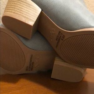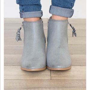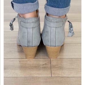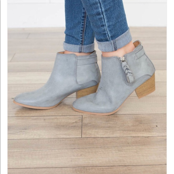 Simple and sweet, this burnish leatherette bootie is the perfect everyday finishing touch to any outfit. Featuring functional side zippers and comfortable low stacked heel, this is a classic go-to. Heel Height: 2 1/4" *brand new/never used with shoebox* actual shoe photos provided* last photo shows right shoe with a small stain, part of the burnish material* fits half a size bigger so 5.5 fits a 6*