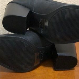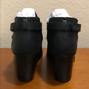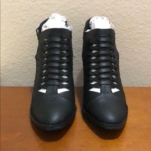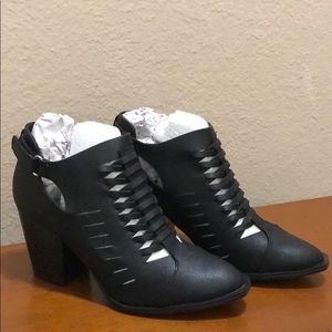 Made with faux leather upper in a distress finish, this almond toe ankle bootie set on a block stacked block heel features a woven design with hook and loop fastener for easy on an off fit. Heel: 3" approx. Fits true to size. Brand new never worn with shoebox. Actual shoe photos provided.
