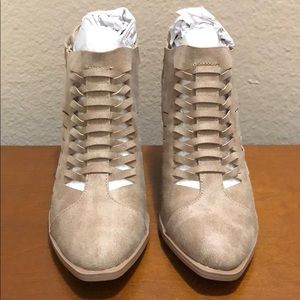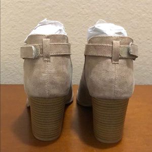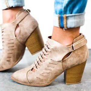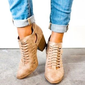 Made with faux leather upper in a distress finish, this almond toe ankle bootie set on a block stacked block heel features a woven design with hook and loop fastener for easy on an off fit. Heel: 3" approx. Fits true to size. Brand new never worn with shoebox. Color: Taupe. Actual shoe photos provided.